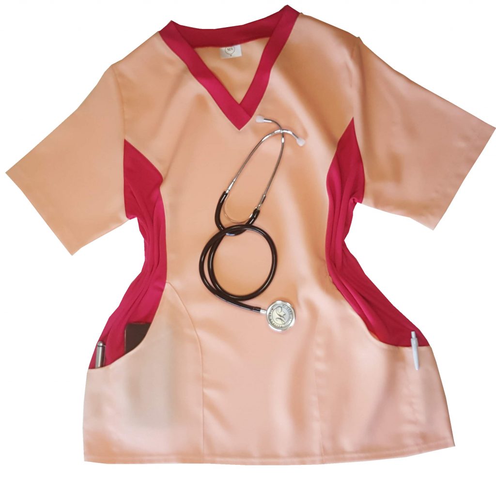 Sassy and sporty custom fitted top with contrast side panels and front inner pockets made with mini matt and trilobal fabric. V-line neck and sleeves. Fit for your medical duty. Definitely stylish and unscripted.