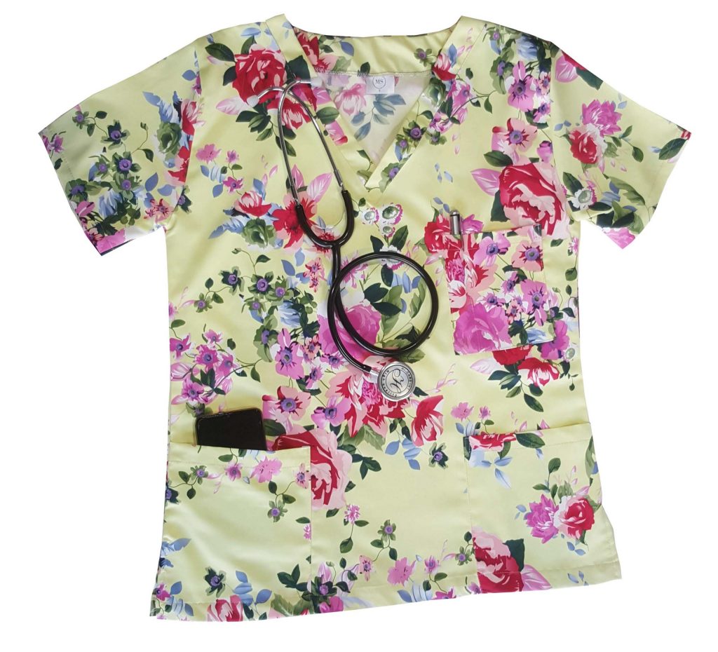 Loose fitting A-line pullover top with a neckband, 2 pockets made with printed Duchess satin material. Reinforced side slits.